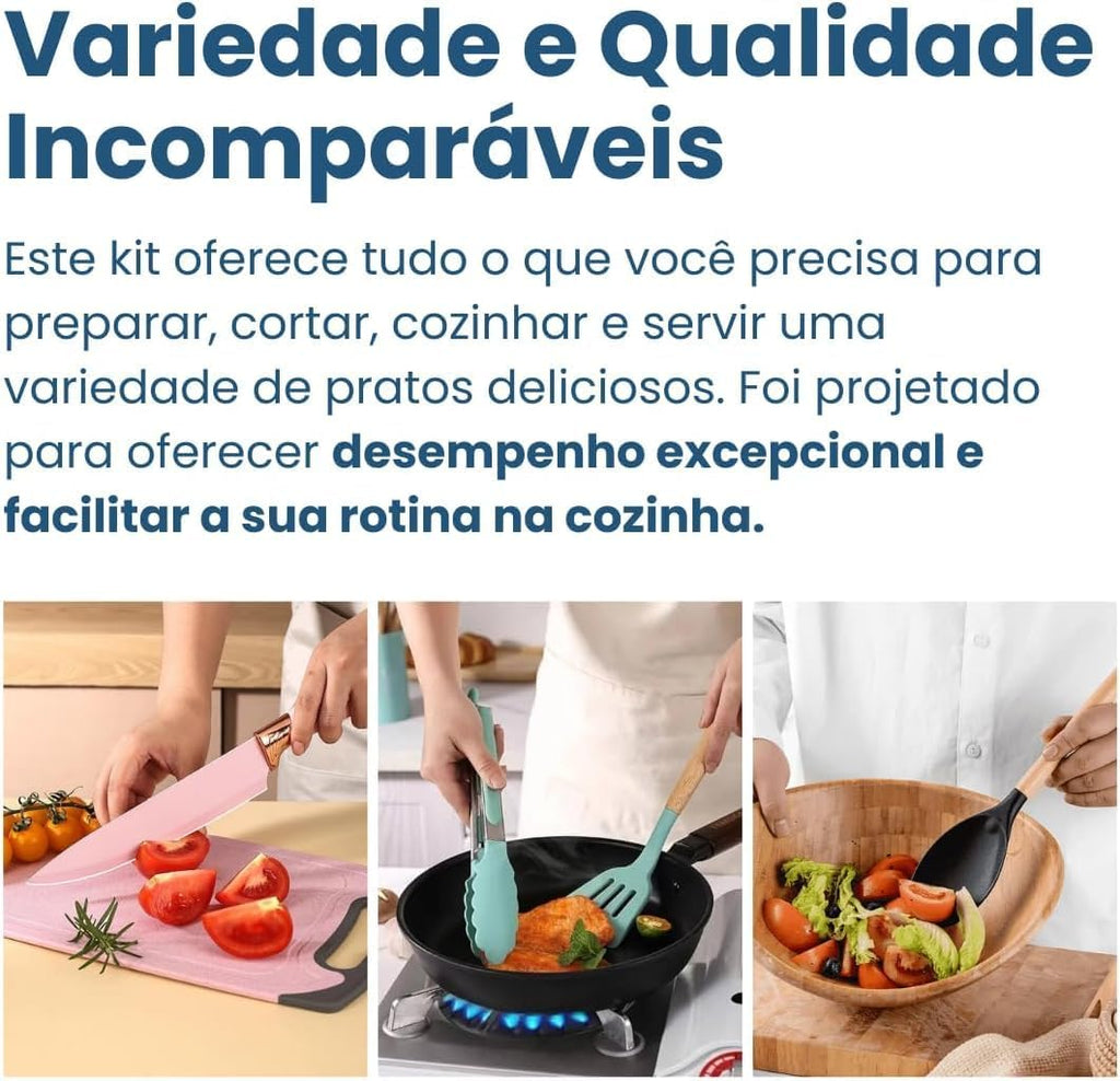 - Além de funcional, o kit contribui para a organização e estética da sua cozinha, com utensílios que podem ser expostos em suportes ou prateleiras, agregando valor decorativo ao ambiente.