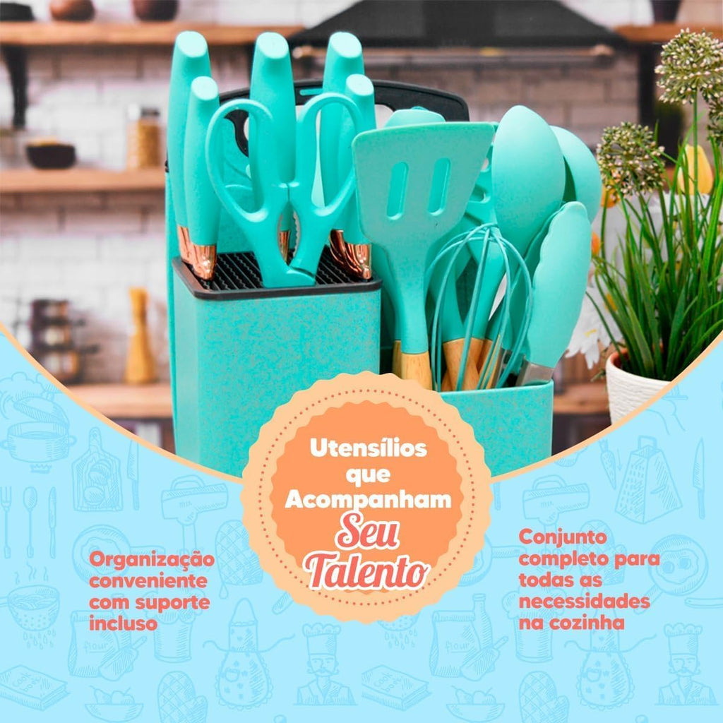 O kit inclui 19 utensílios essenciais, desde espátulas e colheres até conchas e pincéis, cobrindo todas as funções básicas e avançadas na cozinha. As peças são fáceis de limpar, resistentes a manchas e odores, e podem ser penduradas ou armazenadas em gavetas, otimizando o espaço.